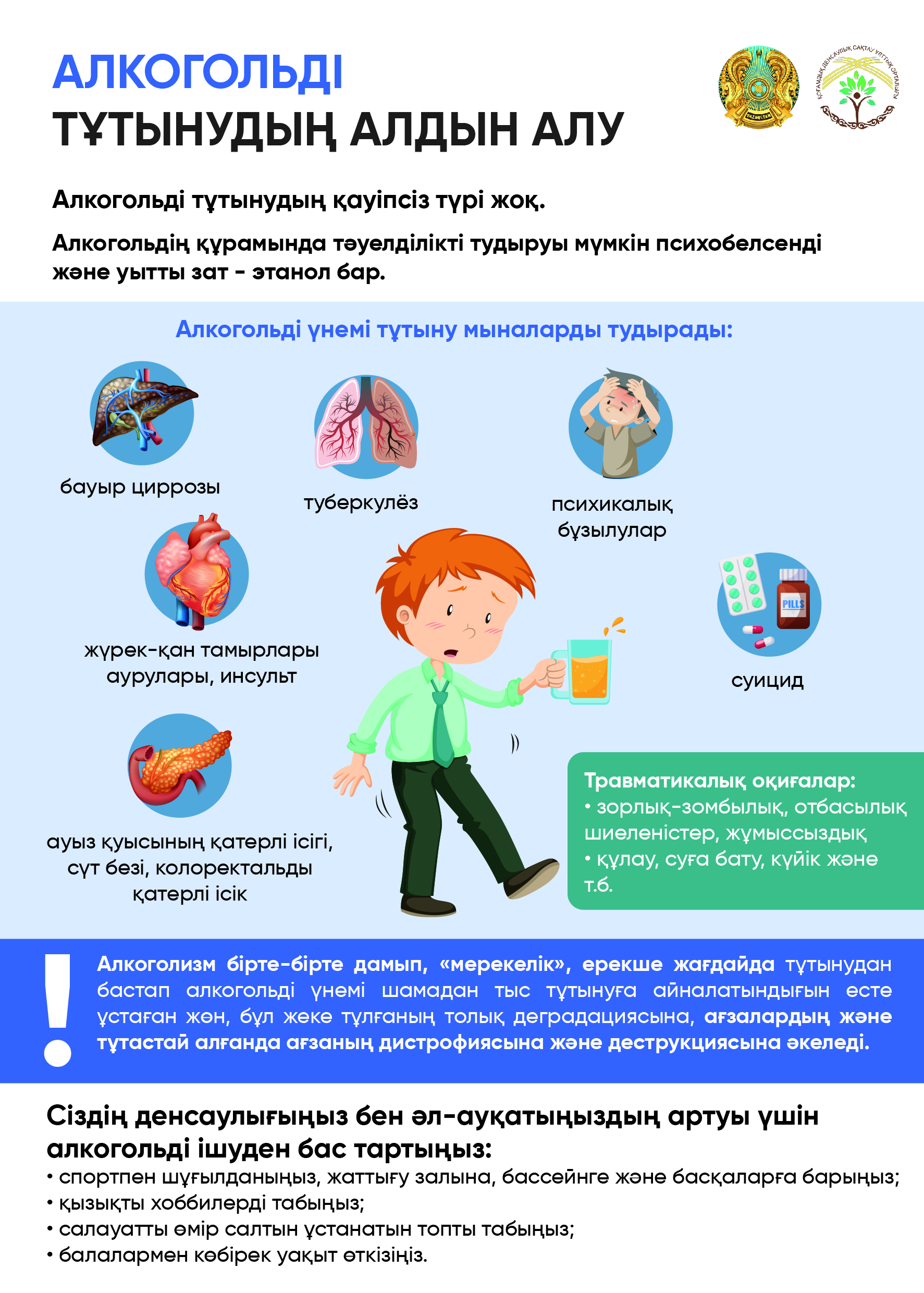 Ішімділік ішуден бас тарту ұлттык күніне орайластырылған «Салауаттылық – өмір салты!» Ішімдік кез келген дозада денсаулыққа зиян тигізеді Денсаулыққатигізерқысқамерзімдіқауіптер Ішімдікті артық ішудің салдары бірден білінеді, бұдан денсаулыққа тигізер көптеген зиянды әсерлердің пайда болу қаупі артады. Бұл, көбінесе, ішімдікті артық ішу нәтижесінде болады. Бұлар: *Автокөлік апаттары, құлау, суға… Read More