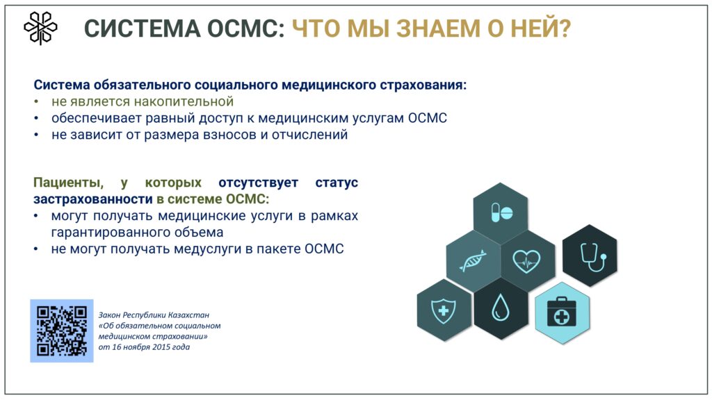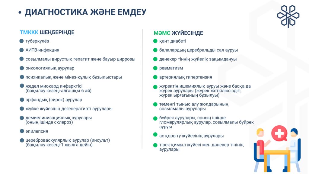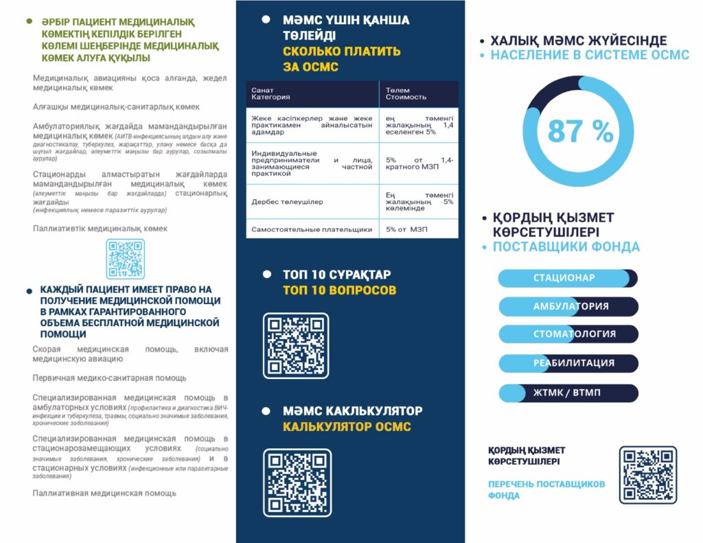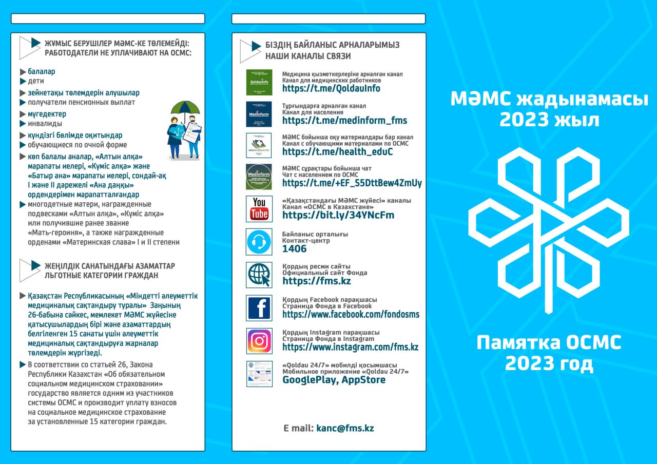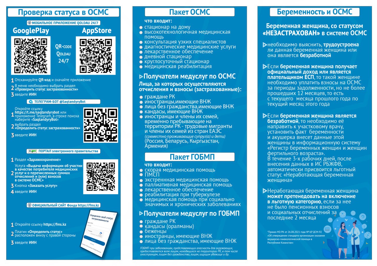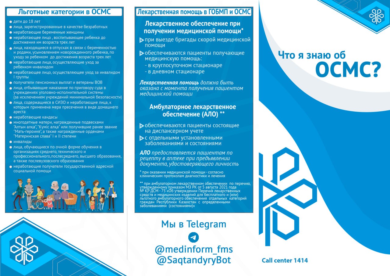 С 1 января 2020 года начата реализация обязательного социального медицинского страхования (ОСМС). Система ОСМС основана на равном доступе всех застрахованных к пакету услуг, независимо от размера взноса. При этом при обращении за помощью по ОСМС пациента не ограничивают в объеме и стоимости медицинских услуг. Казахстанская модель системы ОСМС является социально ориентированной. То есть почти за 11 млн граждан из 15 льготных категорий населения взносы платит государство. Есть два пакета: гарантированный объем бесплатной медицинской помощи (ГОБМП) и обязательное социальное медицинское страхование (ОСМС), согласно которым люди могут получить медицинскую помощь.Государство гарантирует бесплатную медицинскую помощь в рамках ГОБМП. Согласно постановления Правительства РК от 16 октября 2020 года № 672 в нее входят следующие услуги:- Скорая и неотложная медицинская помощь включая санитарную авиацию, а также услуги мобильной бригады при заболеваниях, вызывающих ухудшение эпидемиологической ситуации в стране).- Обслуживание в поликлиниках (диагностика, лечение и управление наиболее распространенными заболеваниями, скрининги для целевых групп населения, наблюдение беременности, профилактические прививки).- Диагностика и лечение при:социально-значимых заболеваниях (туберкулез, ВИЧ и др.)хронических заболеваний (диабет, артериальная гипертензия, вирусный гепатит, ревматоидный артрит и др.).- Медицинская помощь в стационарозамещающих и стационарых условиях в порядке, определяемом уполномоченным органом (в том числе при изоляции лиц, находившихся в контакте с больным инфекционным или паразитарным заболеванием, представляющим опасность для окружающих).- Обеспечение лекарственными средствами при оказании специализированной помощи, а также в соответствии с перечнем заболеваний, против которых проводятся профилактические прививки. Кроме того, получить лекарства на бесплатной основе могут категории граждан, состоящие на диспансерном учете по определенным заболеваниям и состояниям.С более подробной информацией по предоставляемым медицинским услугам в рамках ГОБМП можно ознакомиться по ссылке — adilet.zan.kz/rus/docs/P2000000672#z56Люди, имеющие статус застрахованности в системе ОСМС, получают расширенный доступ к медицинской помощи в пакете обязательного социального медицинского страхования.Согласно постановления Правительства РК от 20 июня 2019 года № 421 в пакет ОСМС входят следующие медицинские услуги:специализированная медицинская помощь в амбулаторных условиях, включающая:1) профилактические медицинские осмотры;2) прием и консультации врачей узкого профиля по направлению участкового врача;3) динамическое наблюдение профильными специалистами лиц с хроническими заболеваниями;4) оказание стоматологической помощи в экстренной и плановой форме отдельным категориям населения по перечню, утвержденному уполномоченным органом;5) диагностические услуги, в том числе лабораторная диагностика (УЗИ, рентген, КТ, МРТ);специализированная, в том числе высокотехнологичная, стационарная медицинская помощь (в плановой и экстренной форме, в том числе проведение лечебно-диагностических мероприятий в приемном отделении круглосуточного стационара);медицинская реабилитация.обеспечение лекарственными средствами при оказании специализированной мед