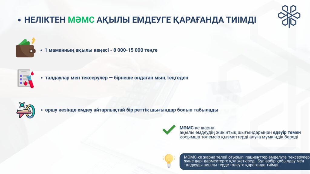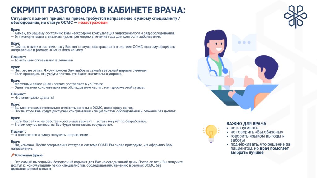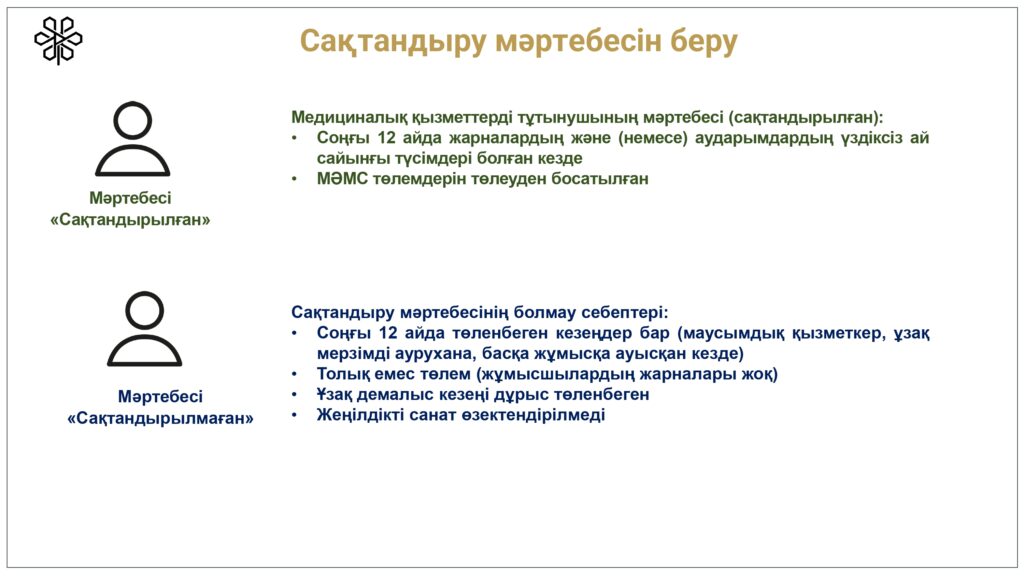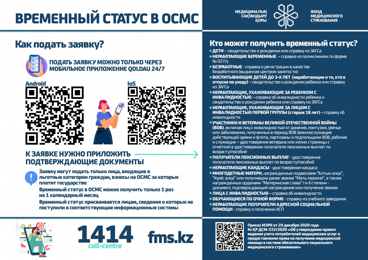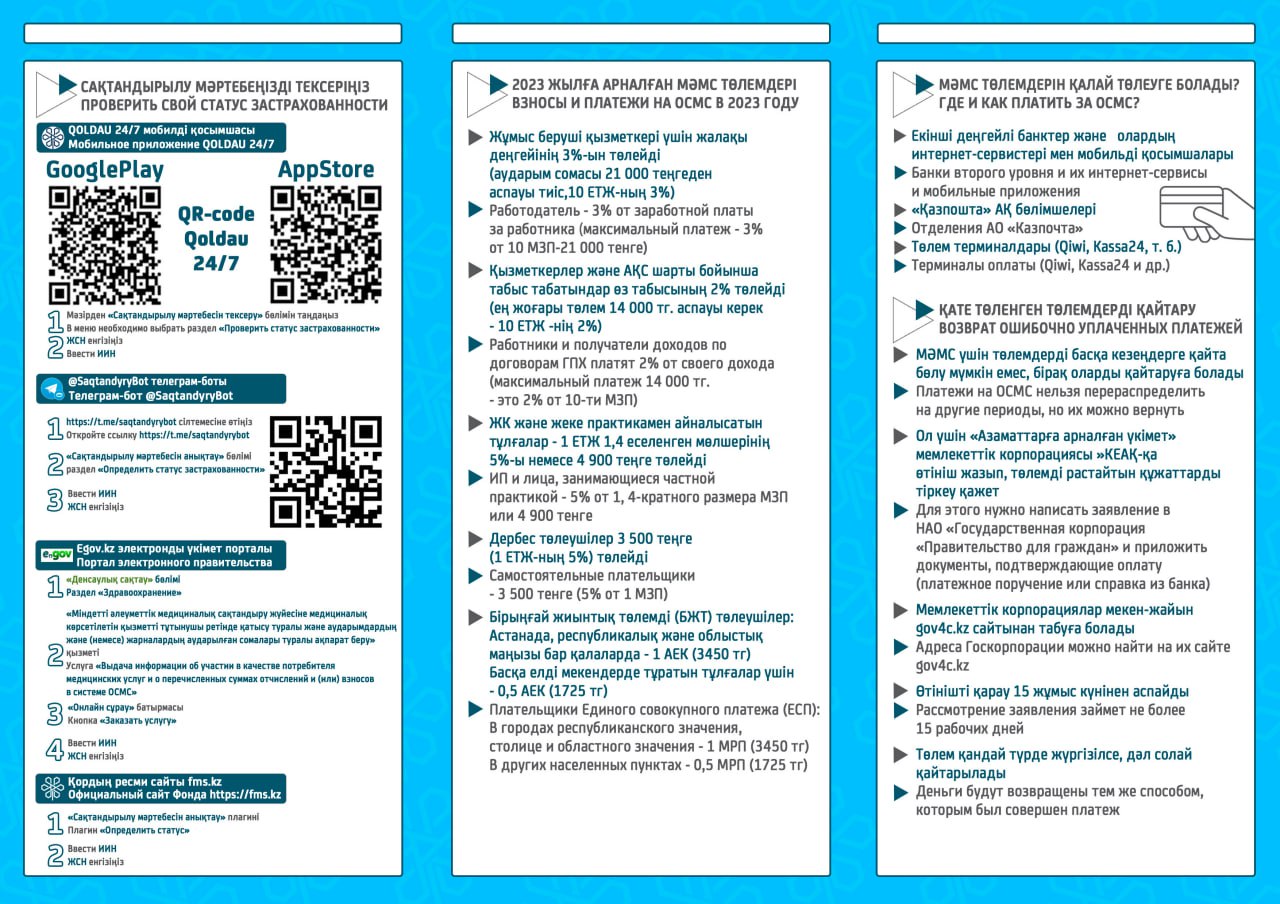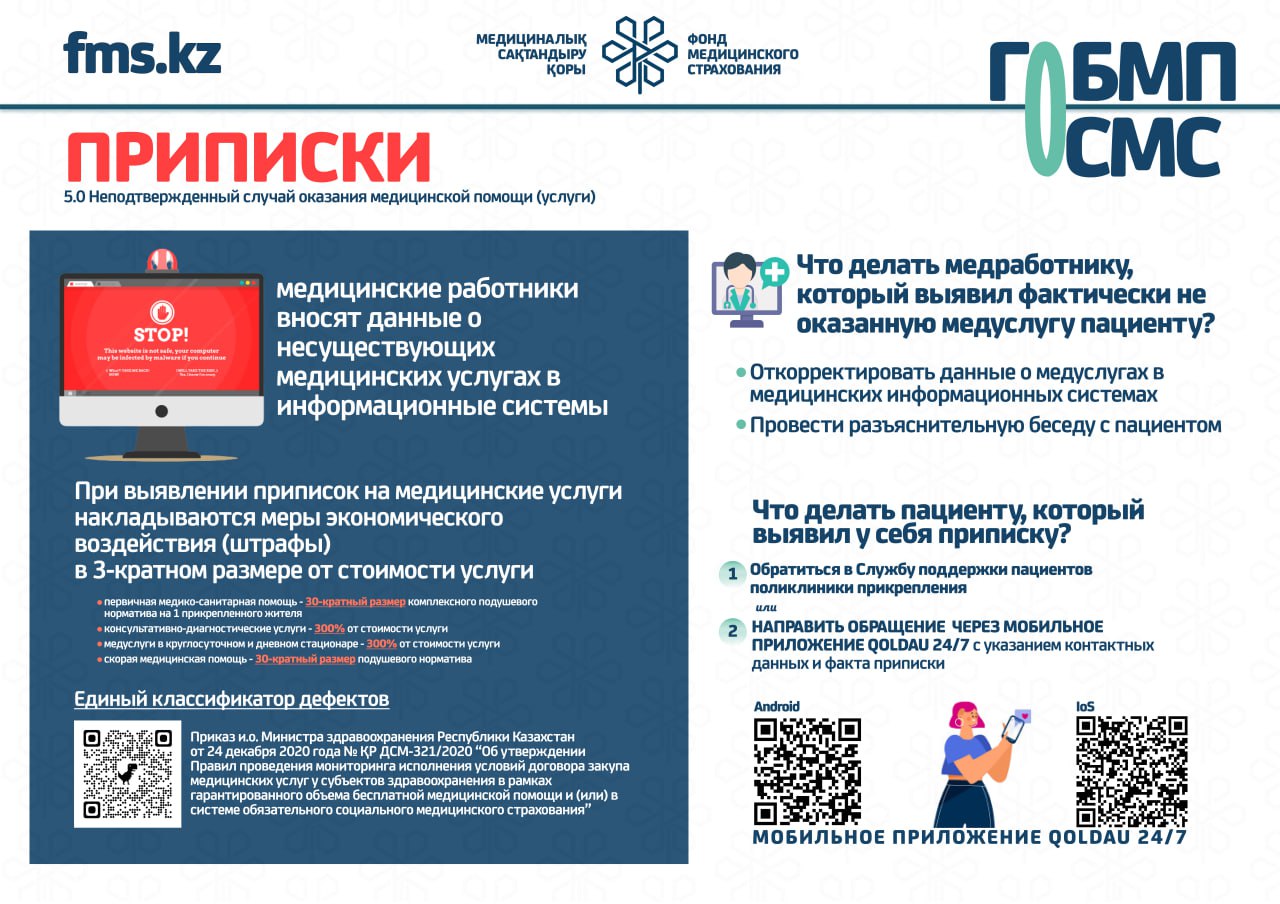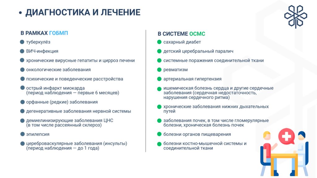 С 1 января 2020 года начата реализация обязательного социального медицинского страхования (ОСМС). Система ОСМС основана на равном доступе всех застрахованных к пакету услуг, независимо от размера взноса. При этом при обращении за помощью по ОСМС пациента не ограничивают в объеме и стоимости медицинских услуг. Казахстанская модель системы ОСМС является социально ориентированной. То есть почти за 11 млн граждан из 15 льготных категорий населения взносы платит государство. Есть два пакета: гарантированный объем бесплатной медицинской помощи (ГОБМП) и обязательное социальное медицинское страхование (ОСМС), согласно которым люди могут получить медицинскую помощь.Государство гарантирует бесплатную медицинскую помощь в рамках ГОБМП. Согласно постановления Правительства РК от 16 октября 2020 года № 672 в нее входят следующие услуги:- Скорая и неотложная медицинская помощь включая санитарную авиацию, а также услуги мобильной бригады при заболеваниях, вызывающих ухудшение эпидемиологической ситуации в стране).- Обслуживание в поликлиниках (диагностика, лечение и управление наиболее распространенными заболеваниями, скрининги для целевых групп населения, наблюдение беременности, профилактические прививки).- Диагностика и лечение при:социально-значимых заболеваниях (туберкулез, ВИЧ и др.)хронических заболеваний (диабет, артериальная гипертензия, вирусный гепатит, ревматоидный артрит и др.).- Медицинская помощь в стационарозамещающих и стационарых условиях в порядке, определяемом уполномоченным органом (в том числе при изоляции лиц, находившихся в контакте с больным инфекционным или паразитарным заболеванием, представляющим опасность для окружающих).- Обеспечение лекарственными средствами при оказании специализированной помощи, а также в соответствии с перечнем заболеваний, против которых проводятся профилактические прививки. Кроме того, получить лекарства на бесплатной основе могут категории граждан, состоящие на диспансерном учете по определенным заболеваниям и состояниям.С более подробной информацией по предоставляемым медицинским услугам в рамках ГОБМП можно ознакомиться по ссылке — adilet.zan.kz/rus/docs/P2000000672#z56Люди, имеющие статус застрахованности в системе ОСМС, получают расширенный доступ к медицинской помощи в пакете обязательного социального медицинского страхования.Согласно постановления Правительства РК от 20 июня 2019 года № 421 в пакет ОСМС входят следующие медицинские услуги:специализированная медицинская помощь в амбулаторных условиях, включающая:1) профилактические медицинские осмотры;2) прием и консультации врачей узкого профиля по направлению участкового врача;3) динамическое наблюдение профильными специалистами лиц с хроническими заболеваниями;4) оказание стоматологической помощи в экстренной и плановой форме отдельным категориям населения по перечню, утвержденному уполномоченным органом;5) диагностические услуги, в том числе лабораторная диагностика (УЗИ, рентген, КТ, МРТ);специализированная, в том числе высокотехнологичная, стационарная медицинская помощь (в плановой и экстренной форме, в том числе проведение лечебно-диагностических мероприятий в приемном отделении круглосуточного стационара);медицинская реабилитация.обеспечение лекарственными средствами при оказании специализированной мед