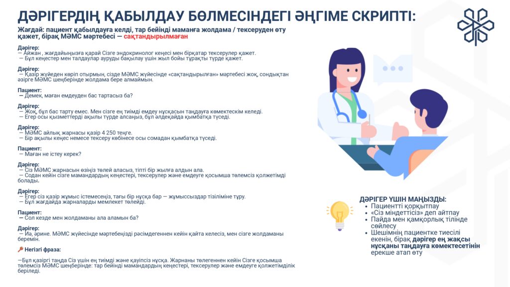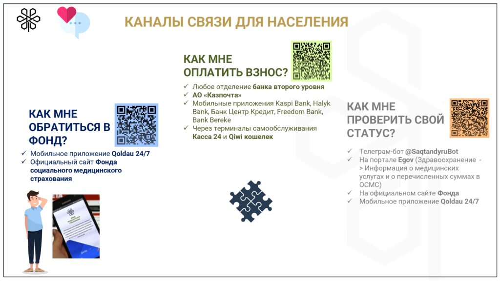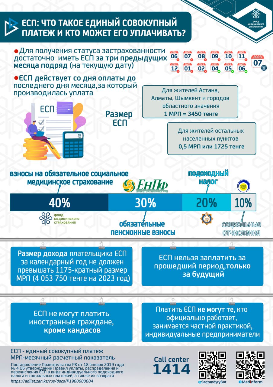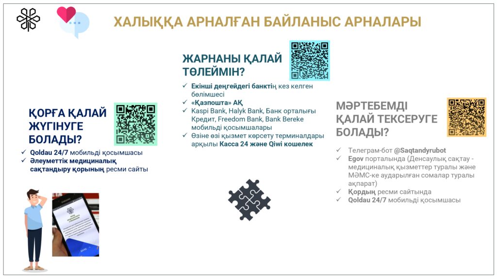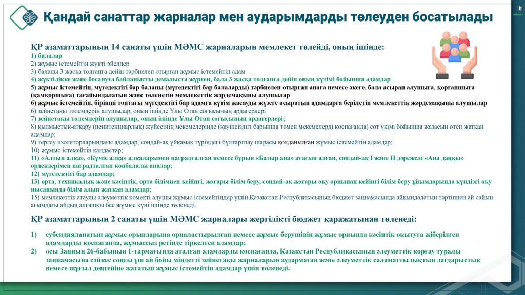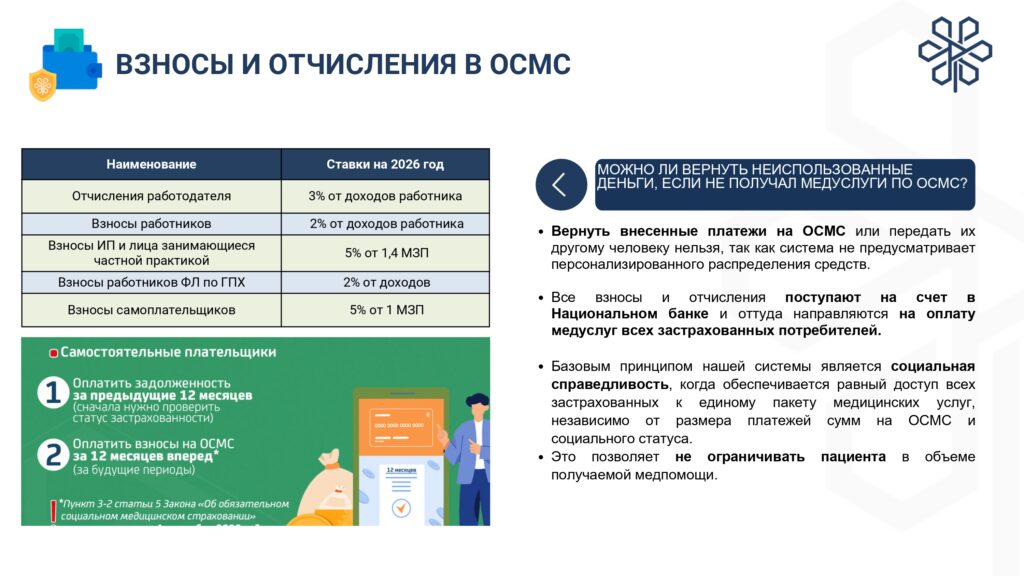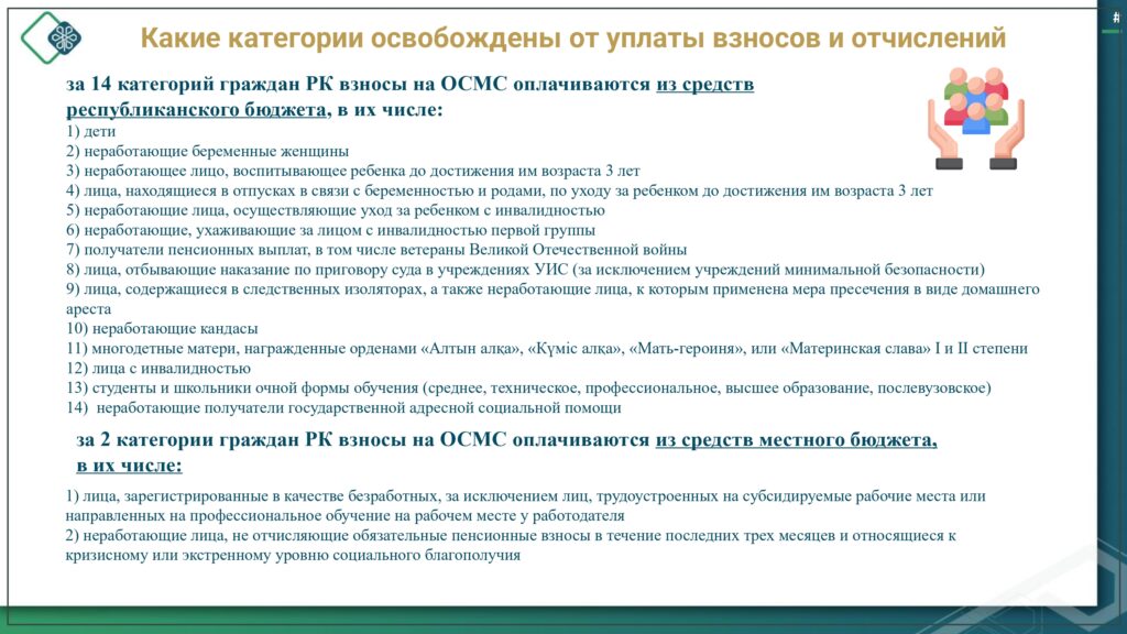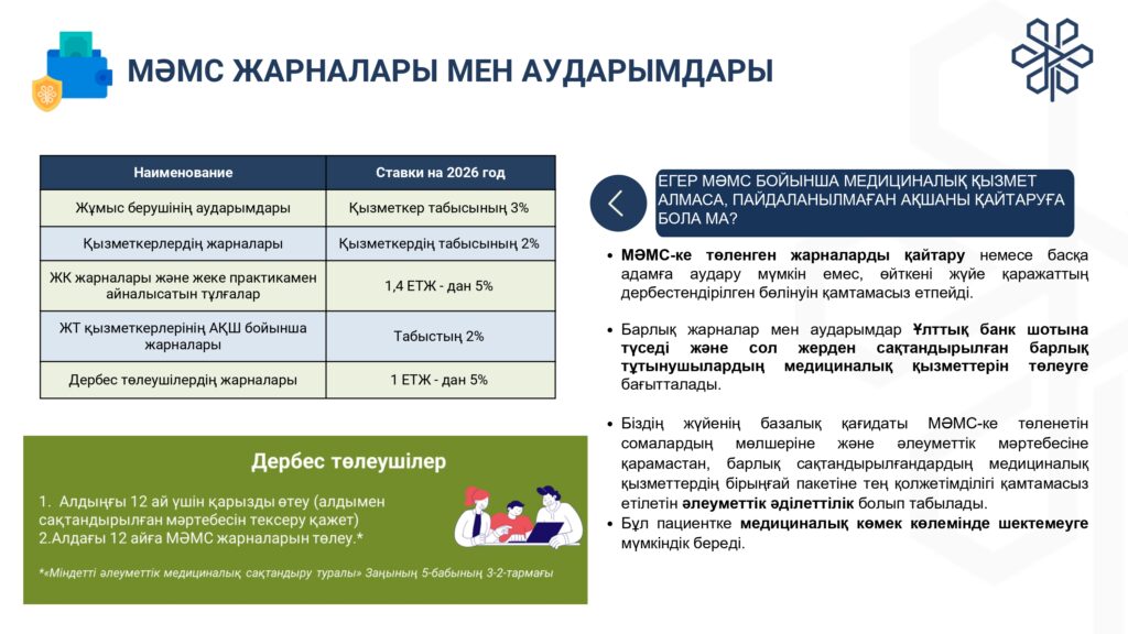С 1 января 2020 года начата реализация обязательного социального медицинского страхования (ОСМС). Система ОСМС основана на равном доступе всех застрахованных к пакету услуг, независимо от размера взноса. При этом при обращении за помощью по ОСМС пациента не ограничивают в объеме и стоимости медицинских услуг. Казахстанская модель системы ОСМС является социально ориентированной. То есть почти за 11 млн граждан из 15 льготных категорий населения взносы платит государство. Есть два пакета: гарантированный объем бесплатной медицинской помощи (ГОБМП) и обязательное социальное медицинское страхование (ОСМС), согласно которым люди могут получить медицинскую помощь.Государство гарантирует бесплатную медицинскую помощь в рамках ГОБМП. Согласно постановления Правительства РК от 16 октября 2020 года № 672 в нее входят следующие услуги:- Скорая и неотложная медицинская помощь включая санитарную авиацию, а также услуги мобильной бригады при заболеваниях, вызывающих ухудшение эпидемиологической ситуации в стране).- Обслуживание в поликлиниках (диагностика, лечение и управление наиболее распространенными заболеваниями, скрининги для целевых групп населения, наблюдение беременности, профилактические прививки).- Диагностика и лечение при:социально-значимых заболеваниях (туберкулез, ВИЧ и др.)хронических заболеваний (диабет, артериальная гипертензия, вирусный гепатит, ревматоидный артрит и др.).- Медицинская помощь в стационарозамещающих и стационарых условиях в порядке, определяемом уполномоченным органом (в том числе при изоляции лиц, находившихся в контакте с больным инфекционным или паразитарным заболеванием, представляющим опасность для окружающих).- Обеспечение лекарственными средствами при оказании специализированной помощи, а также в соответствии с перечнем заболеваний, против которых проводятся профилактические прививки. Кроме того, получить лекарства на бесплатной основе могут категории граждан, состоящие на диспансерном учете по определенным заболеваниям и состояниям.С более подробной информацией по предоставляемым медицинским услугам в рамках ГОБМП можно ознакомиться по ссылке — adilet.zan.kz/rus/docs/P2000000672#z56Люди, имеющие статус застрахованности в системе ОСМС, получают расширенный доступ к медицинской помощи в пакете обязательного социального медицинского страхования.Согласно постановления Правительства РК от 20 июня 2019 года № 421 в пакет ОСМС входят следующие медицинские услуги:специализированная медицинская помощь в амбулаторных условиях, включающая:1) профилактические медицинские осмотры;2) прием и консультации врачей узкого профиля по направлению участкового врача;3) динамическое наблюдение профильными специалистами лиц с хроническими заболеваниями;4) оказание стоматологической помощи в экстренной и плановой форме отдельным категориям населения по перечню, утвержденному уполномоченным органом;5) диагностические услуги, в том числе лабораторная диагностика (УЗИ, рентген, КТ, МРТ);специализированная, в том числе высокотехнологичная, стационарная медицинская помощь (в плановой и экстренной форме, в том числе проведение лечебно-диагностических мероприятий в приемном отделении круглосуточного стационара);медицинская реабилитация.обеспечение лекарственными средствами при оказании специализированной мед